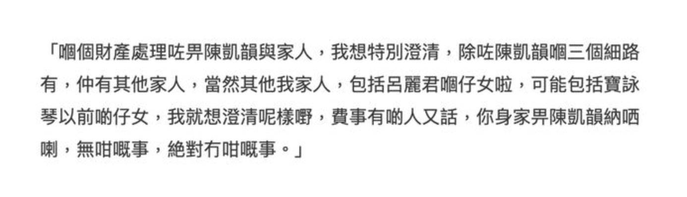刘秀盈这么说其实也没有错,分多分少都是分,那是分了多少就不得而知了。而实际上刘銮雄也就分产这个事情在2023年1月的举办记者招待会的时候公开回应过,追溯起来,当时他举办记者招待会就是与吕丽君有关。吕丽君2022年底遭遇财困,被迫向刘銮雄借钱,刘銮雄心软就答应了,结果被拍到与吕丽君同框的画面,所以他专门开记者会澄清与吕丽君的关系。在记者会上他就分产的事情进行了简单地说明,当时他就说到,财产除了陈凯韵(甘比)的三个子女外,其他的家人,包括吕丽君的子女,宝永琴的子女可能都有,澄清主要是不想甘比被误解拿了自己全部的财产,但至于分配的比例就不得而知。