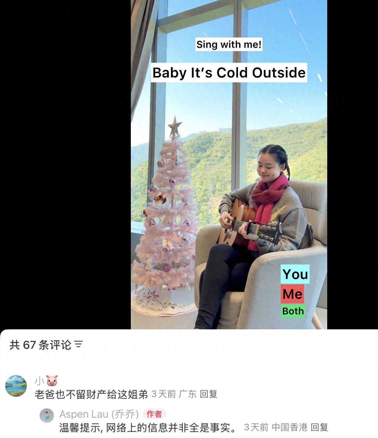 圣诞节将至,刘秀盈在社交平台上分享在白建时道的豪宅分享装扮圣诞树的照片,并且还分享了在窗户边,在粉色的圣诞树前抱着吉他自弹自唱庆祝圣诞的视频。刘秀盈表现亲民,在晒照之余还与网友互动,其中有网友留言称“老爸也不留财产给这姐弟”,没想到刘秀盈还去回复了,她称“温馨提示,网络上的信息并非全是事实”。这是刘秀盈第一次回应分产的问题,她回应得比较含糊,但是也潜台词就是否认,刘銮雄没有分产给自己与弟弟。