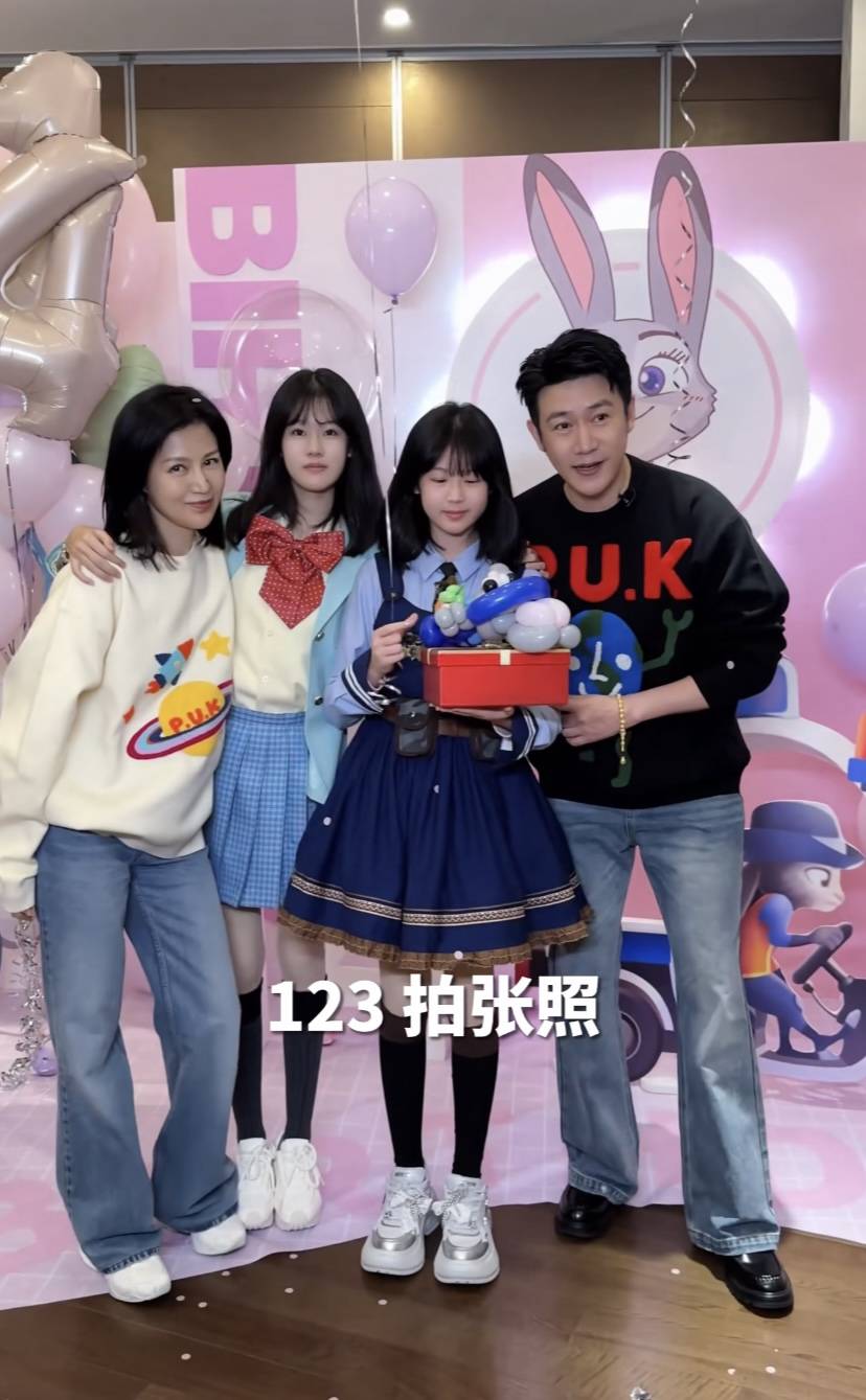 他们一家人在朱迪的卡牌前牌照,小叶子手里拿着礼物盒子还有气球,陆毅稍微弯着身子和小叶子说话,一看就是个女儿奴。