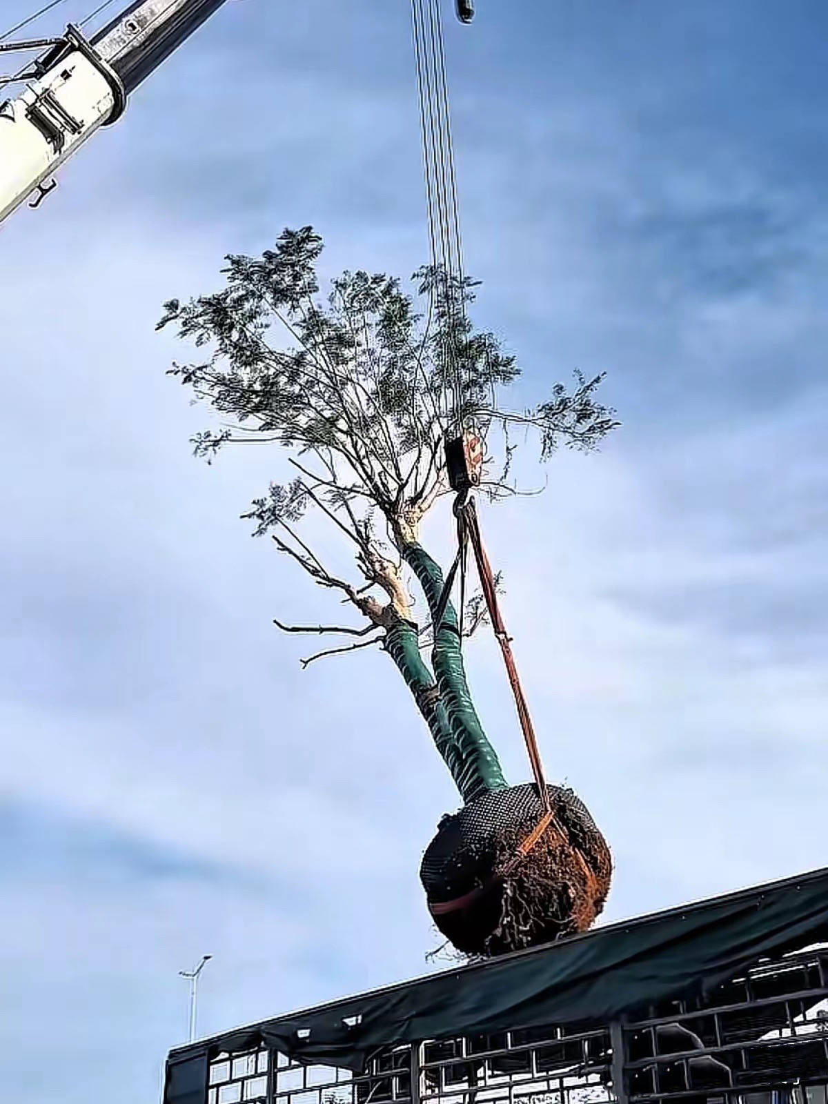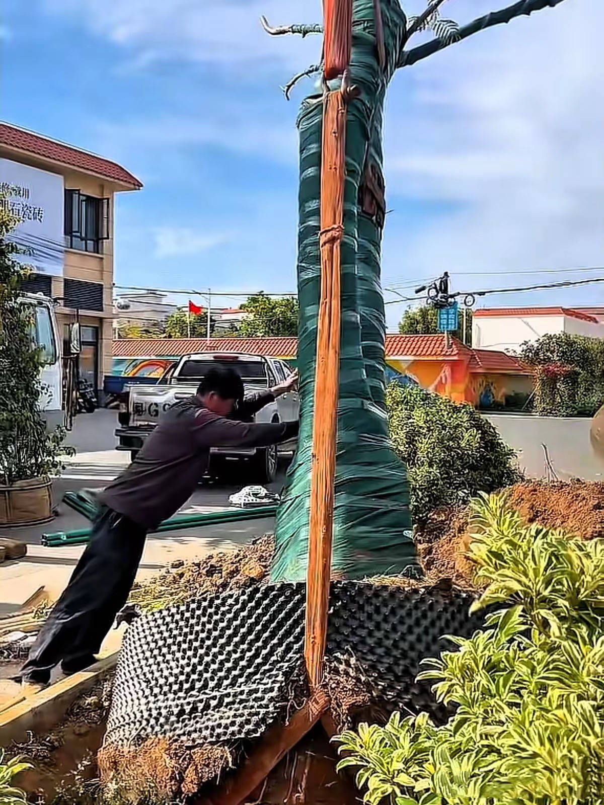借助吊车栽种,全红婵爸爸只需要看着把凤凰树栽到合适的位置就可以。要是放在以往全靠人力,想要移栽这么大一棵凤凰树,非得累的人扒层皮。