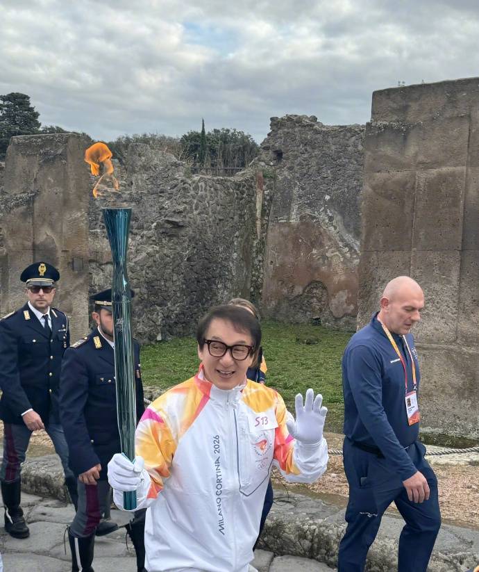 成龙作为2026年米兰-科尔蒂纳冬奥会火炬手,在意大利庞贝古城完成圣火传递。身着白红黄三色火炬手制服的他,手持燃烧的圣火穿越古罗马遗址,途中突然停下脚步,即兴摆出成名作《醉拳》中的标志性招式。
