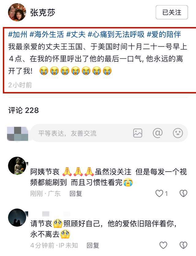 此后的时间里,张克莎因为老公的去世而患上了抑郁,也就是在那个时候,有网友劝她回国,毕竟这里才是她的家,有熟悉的人,有熟悉的面孔,也有熟悉的场景。