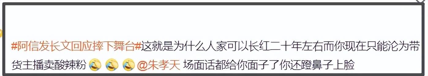 而后,朱孝天在个人粉丝群回应了阿信的连番感谢。在一张流传出的朱孝天VIP粉丝群中,有粉丝称阿信提到知晓演唱会阵容没有符合大家的期待,但来日方长会等到大家想要的阵容,其他粉丝则跟着吐槽阿信应该有自知之明,朱孝天特意回了这位粉丝,表示阿信在外面说了好几次,但他本人没有收到任何消息,吐槽阿信说的是场面话,听听就算了。