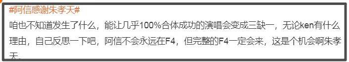 朱孝天缺席F4演唱会的争论不休,在阿信补位登台摔倒受伤的情况下,不少歌迷劝他离开F4的演唱会,阿信针对此事做出多番回应,他先是在演唱会现场感谢暂未奔赴的朱孝天,承诺自己会回