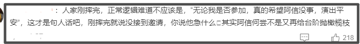 但反之朱孝天的回应既没逻辑也没情商,在得知阿信因为演唱会摔倒受伤的情况下,不仅没有表达人性关怀,还在较真是否有没有被邀请,显得过于利己。