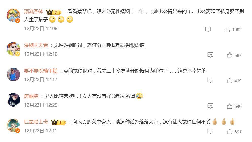 这番毫不遮掩的言论,迅速将“无性婚姻”这个隐秘角落推到了公众辩论的聚光灯下。支持者纷纷为向太的“敢说”点赞,称赞她以坦荡姿态打破了传统语境中的性羞耻,鼓励人们正视婚姻中的本能与快乐,是“女中豪杰”做派。