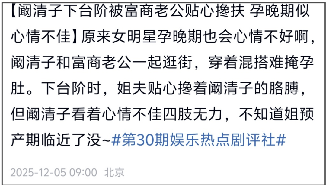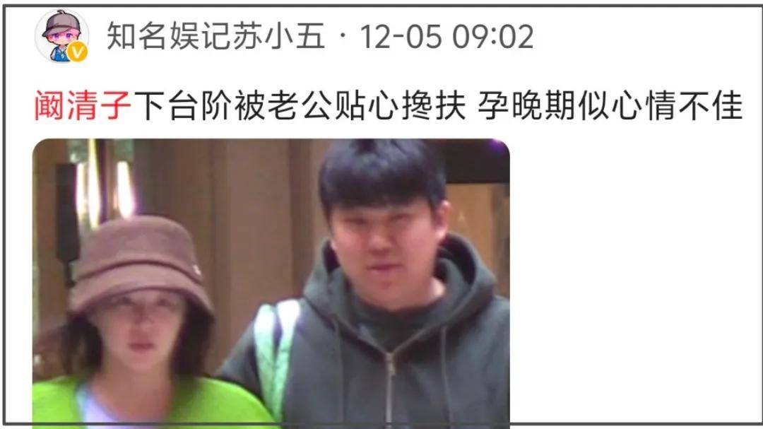 就在不到一个月前,2025年12月5日,还有娱记拍到孕晚期的阚清子和丈夫外出,当时娱记标题就写着“阚清子下台阶被老公贴心搀扶,孕晚期似心情不佳”。