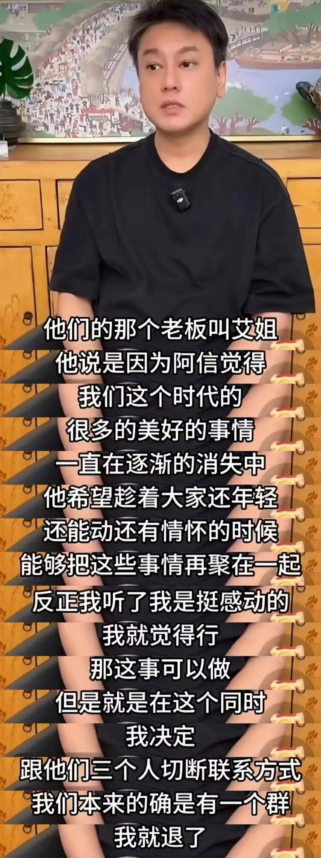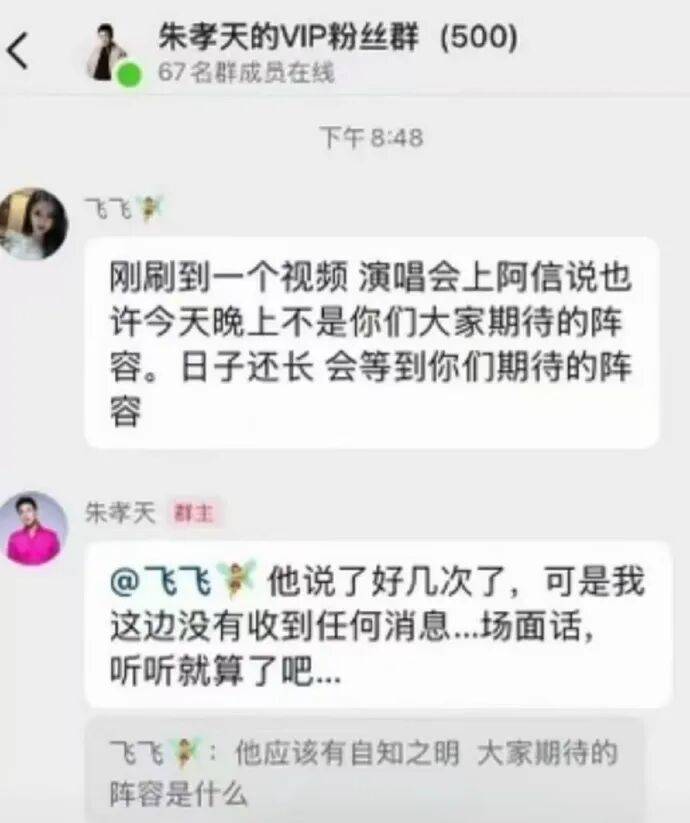 之后朱孝天在粉丝群回应阿信:“他说好几次了,可是我这边没有收到任何消息……场面话,听听就算了吧……”