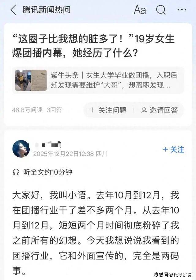 “那些大哥都是想睡你,干团播就算做得再好,结局都是‘下海’。”近日,26岁女生小羽(化名)在社交平台发声,曝光了自己短暂从事团播工作两个月的惊魂经历。她