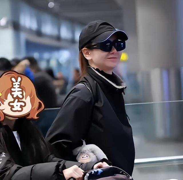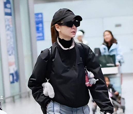 戚薇身穿黑色上衣搭配牛仔裤,戴着墨镜和帽子,一脸高冷地走在最后。