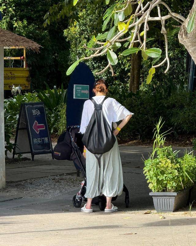 曝光画面中,戚薇背着黑色背包穿搭清凉,正在照看坐在婴儿车里的小儿子Seven。