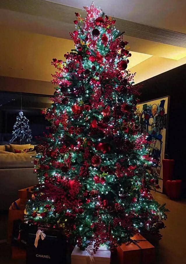 红色圣诞帽戴在两只宠物狗头上。客厅堆满迪奥与香奈儿的礼盒。近两米的圣诞树几乎触到天花板,灯串闪烁。这座香港三层豪宅估值十亿港元,节日场景里没有孩子的身影。圣诞节庆祝