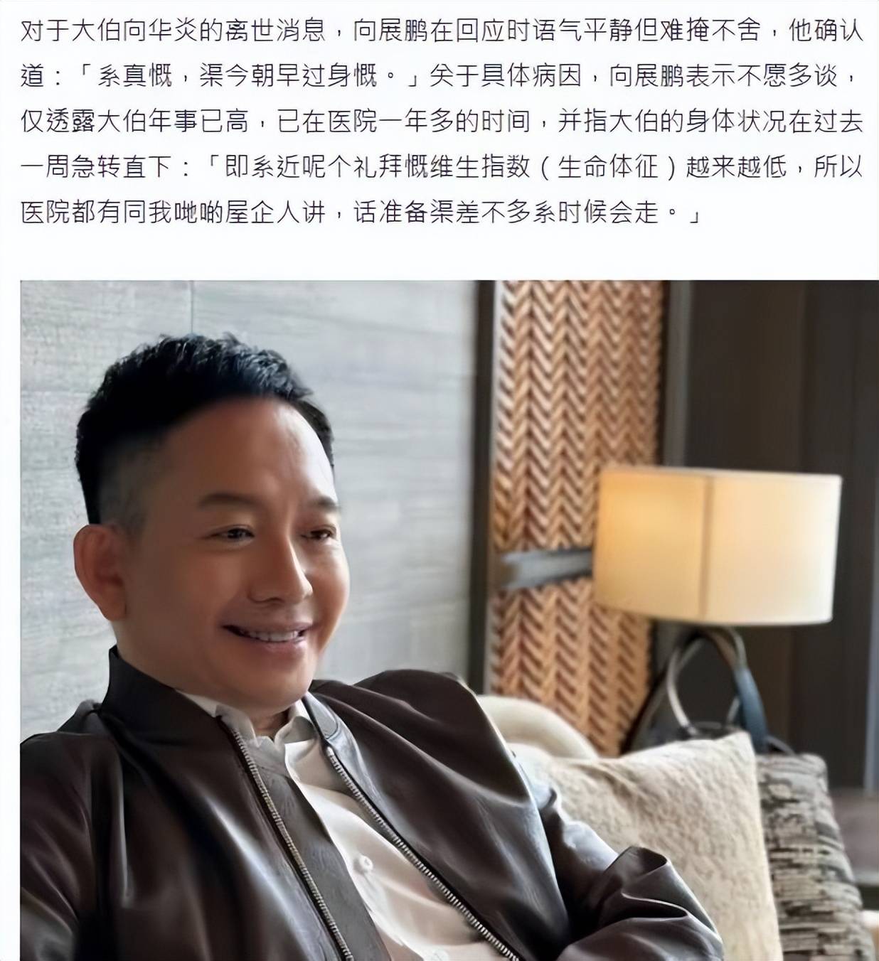 在向展鹏曝光的细节中,我们了解到向华炎已经住院一年多了,并且在过去一周急转直下,甚至向家人早就收到了医生通知,家人们也做好了他会离开的打算。