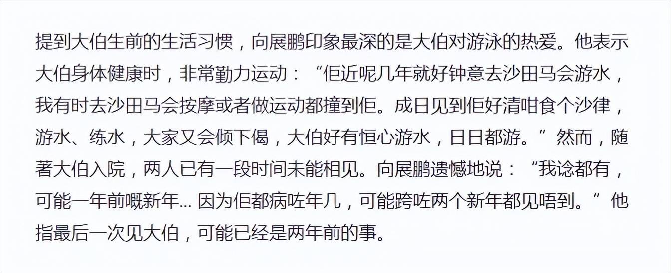 向华炎对游泳健身这件事很有恒心,几乎每天都会游。只是向展鹏遗憾的说,最后一次见到大伯应该是2年前了,也就是向华炎住院后,向展鹏就没见到过了。