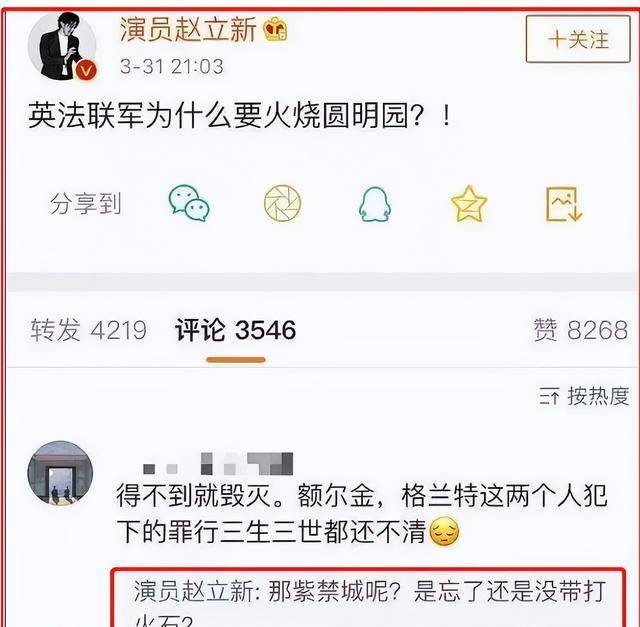 2019年3月,他在微博抛出一个匪夷所思的问题:“英法联军为何要火烧圆明园?”