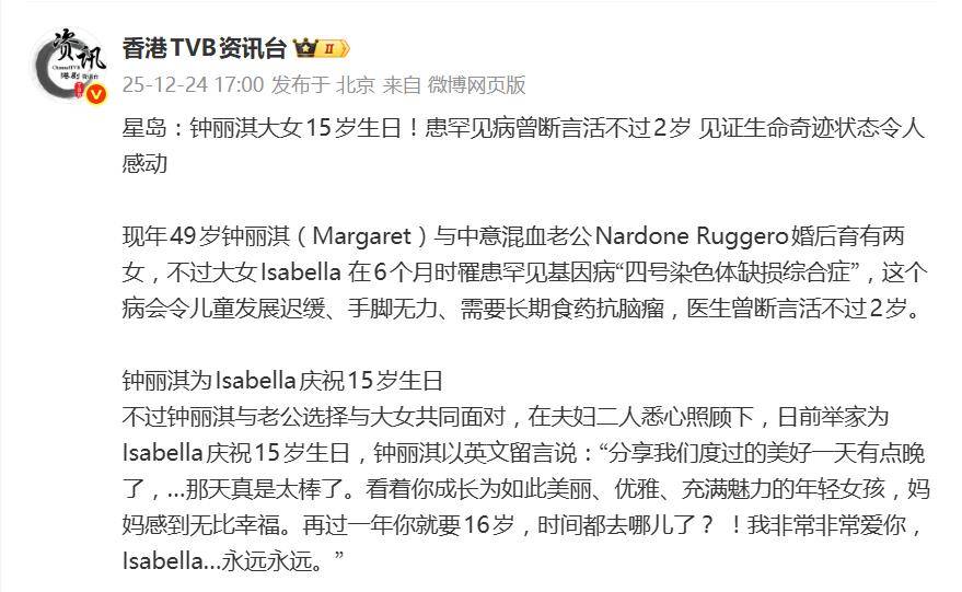 据12月24日报道,TVB女演员钟丽淇为女儿庆祝15岁生日的消息,在社交平台上暖成了一片泪海。照片里,头戴金色小皇冠的伊莎贝拉笑靥如花,一身少女装扮宛如公主。可谁能想到,这个温馨瞬间的背后,是一场与死神赛跑了整整14年的生命马拉松——医生曾白纸黑字地断言,这个女孩“活不过2岁”。
