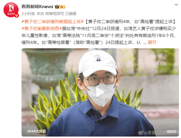 据台湾“中央社”12月24日报道,台湾艺人黄子佼涉嫌购买少年儿童性影像,台湾“高等法院”11月底二审依“个资法”判处其有期徒刑1年6个月,缓刑4年。台“高等检察署”(简称“高检署”)24日提起上诉,认为黄子佼对于少年儿童身心健全发展侵害甚巨,不宜宣告缓刑。