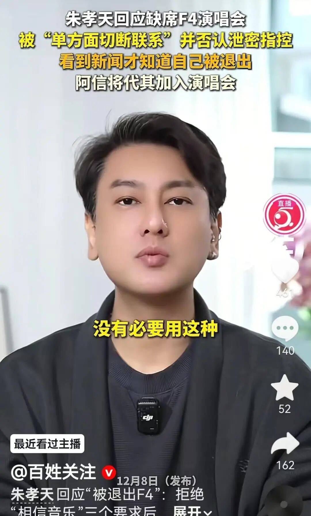 朱孝天一直被质疑情商太低,他多次吐槽F4歌曲“难听”、称与成员“九年不联系”,此次发言再被批“又卑又亢”。