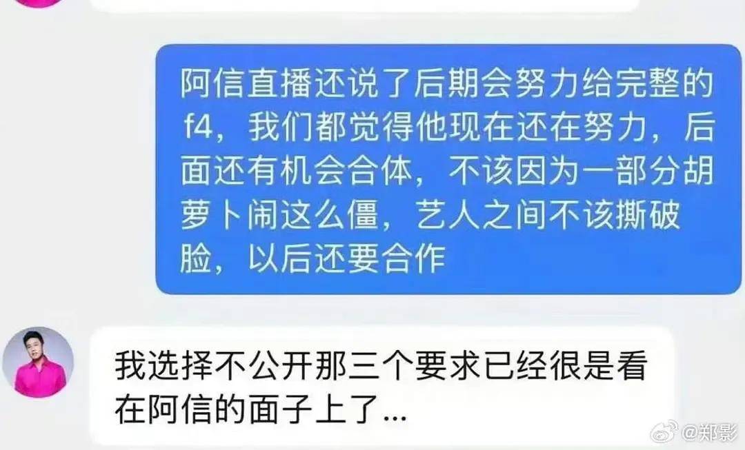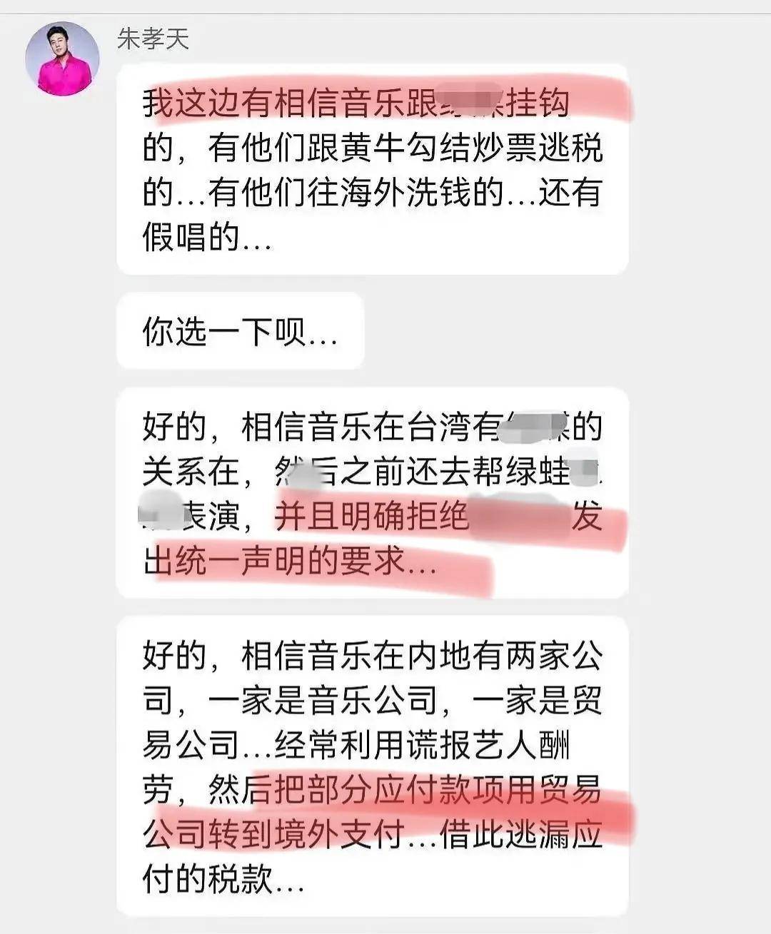 可以说,朱孝天这爆料很猛,五月天和相信音乐如果不能及时回应相关质疑,那么口碑又要跌入谷底。当然,朱孝天这些爆料能不能成真,最终还是要看他掌握的证据有多硬核,不然也是口头游戏,对五月天的损伤有限,反而会让自己的口碑崩坏。从朱孝天的群聊截图来看,他手里还有演唱会相关证据,没明说三个要求已经给阿信面子了,也说明他目前针对的主要对象是相信音乐。