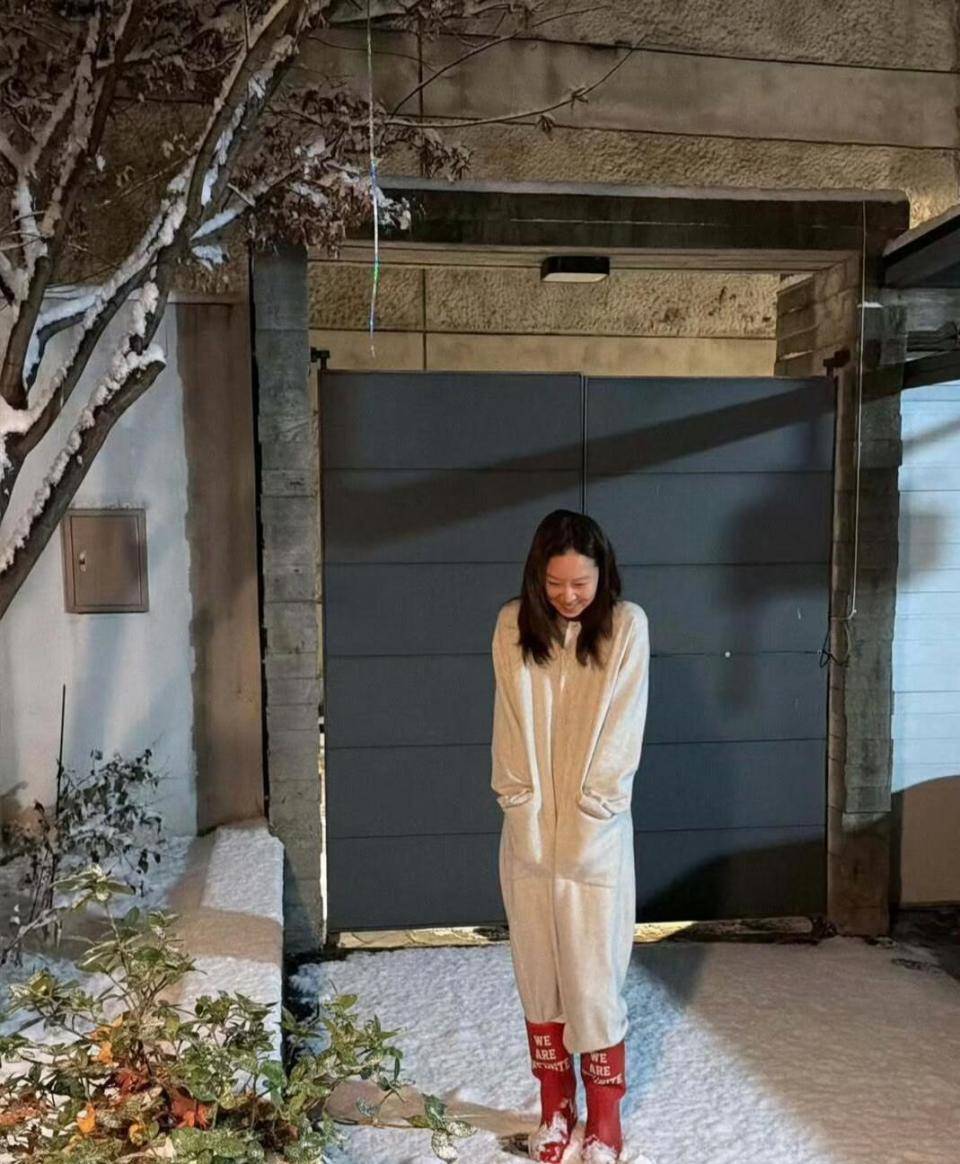 韩国女演员孔孝真的日常私服展现出一种随性自在的风格。 她在金宇彬和申敏儿的婚礼上选择了白色蕾丝与黑色毛衣的叠穿,搭配黑丝并采用下衣失踪的穿法。 这种简约利落的造型与她一贯的松弛感相契合。 在首尔初雪的夜晚,孔孝真直接穿着连体睡衣亮相,打破了明星必须盛装出席的常规。 她的穿搭原则始终把舒适放在首位,不受他人眼光束缚。