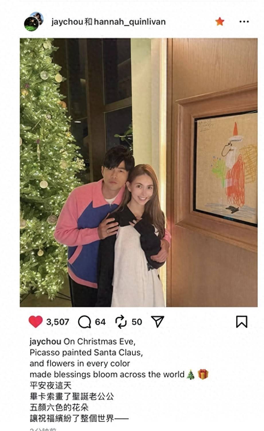周杰伦在平安夜凌晨发了和昆凌的合影,两人穿同款粉色外套靠在一起。照片里昆凌素颜没化妆,周杰勋剃了胡子显得年轻,背景墙上挂着圣诞主题的抽象画。这条动态点赞破百万,很多人