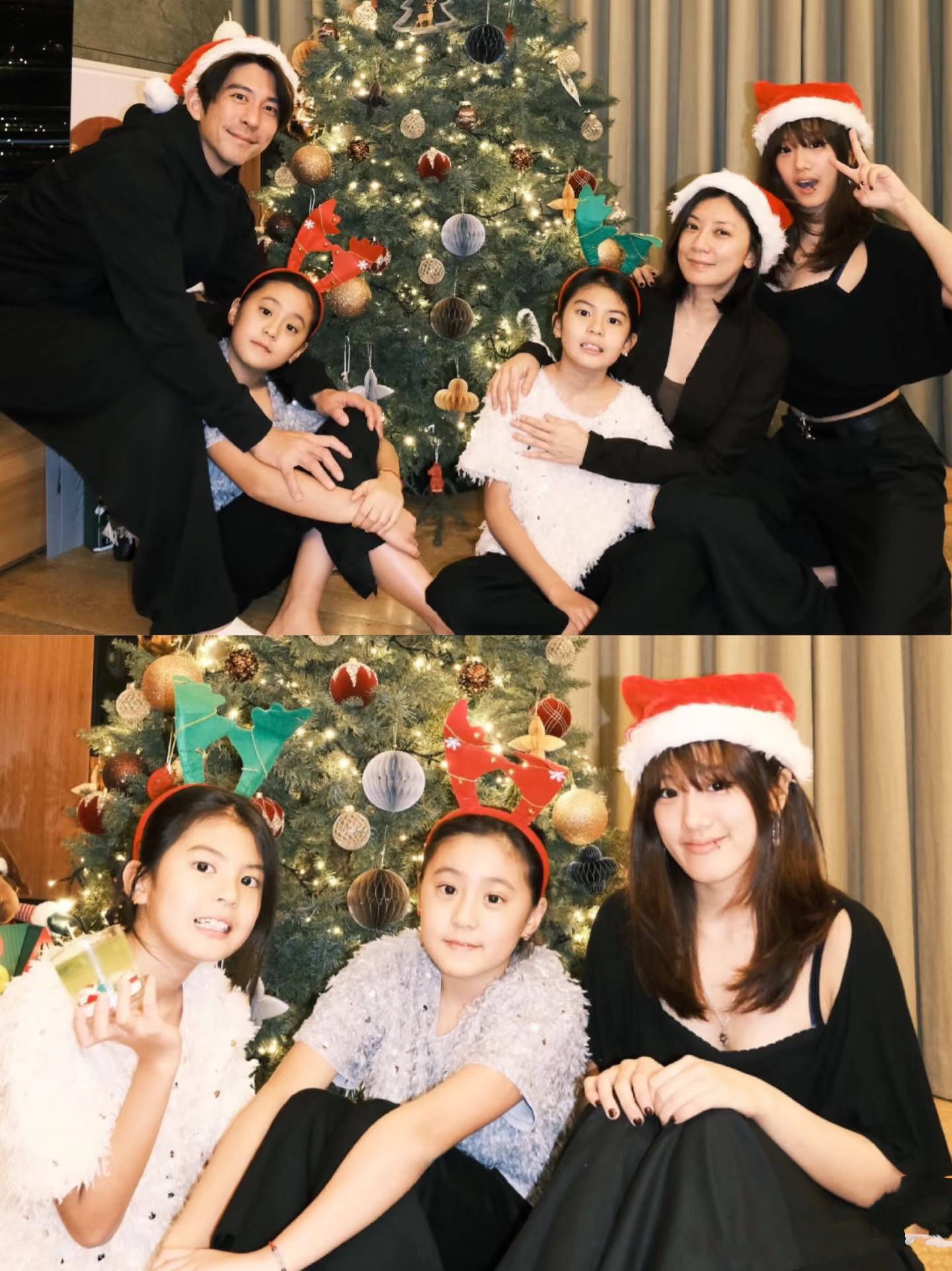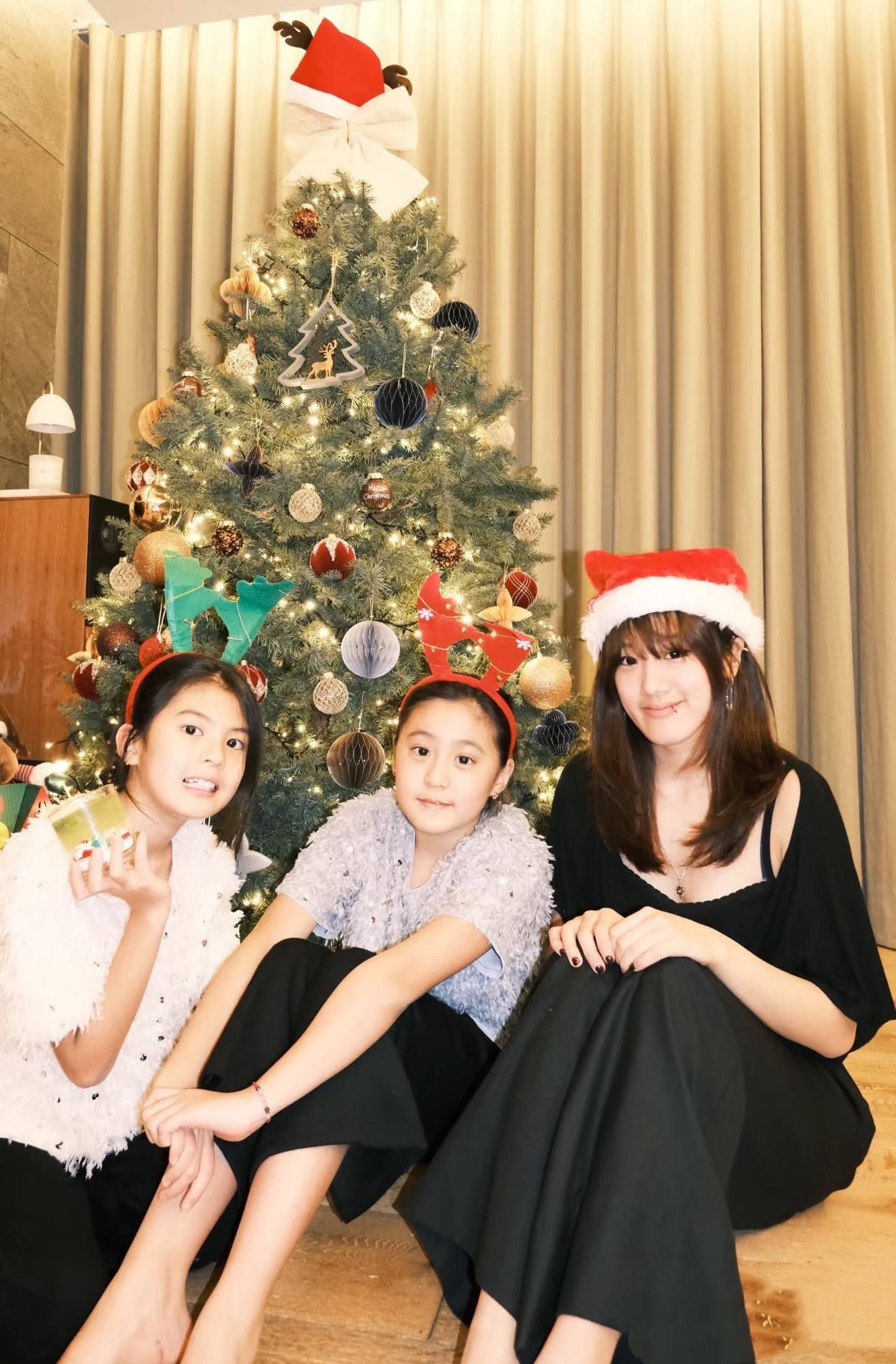 咘咘和波妞没有戴圣诞帽,而是点缀了好看的发箍。虽然梧桐妹也是女儿,但梧桐妹年龄大一些,选择了跟爸妈一样的风格。