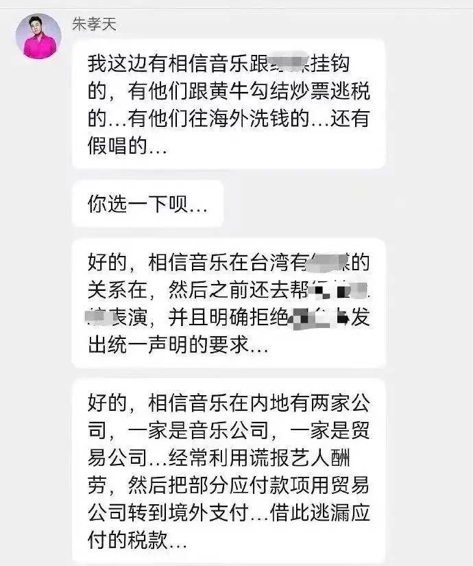 在粉丝群里,朱孝天继续说道,他举报相信音乐的不仅是以上这些违规内容,其中还涉及到对方在内地的两家公司,包括音乐公司和贸易公司。
