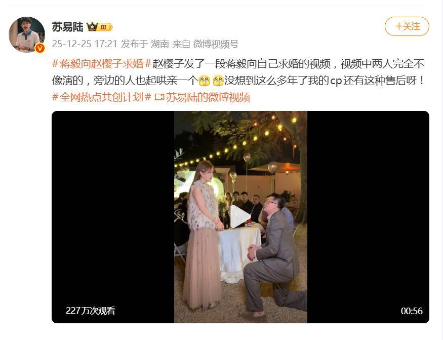 12月25日,演员赵樱子发布的一条“蒋毅单膝跪地求婚”短视频,瞬间冲上热搜。但评论区却罕见地没有祝福,反而被“剧本痕迹太重”、“为了带货拼了”的质疑声刷屏。一场本该浪漫的“官宣”,硬生生演成了全民找茬的“打假现场”。