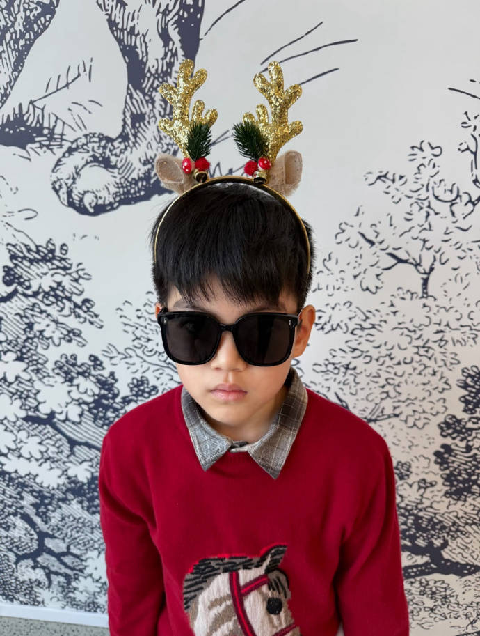 照片里,小星星头戴金色鹿角发箍,架着一副酷酷的黑色墨镜,身穿红色毛衣搭配格纹衬衫,身高已经快够到妈妈肩膀(陈妍希约1.6米,推算小星星近1.5米)。在一场与周扬青、潘玮柏夫妇等约20位好友的圣诞聚会中,他站在红色烛台和礼物堆前,举止显得相当沉稳自然。陈妍希的配文满是温馨:“和喜欢的人一起过节。”