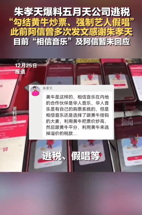 12月25日,多个关于艺人朱孝天的话题登上热搜。据悉,有网友近日发出了自称是朱孝天在粉丝群发言的截图,图中的聊天内容显示,有一个名为“朱孝天”的用户发出多段文字内容,指五月天所属经纪公司相信音乐,涉嫌勾结黄牛炒票、通过跨境贸易公司转移资金逃税等内容。相关内容还涉及华人文化和大麦网。