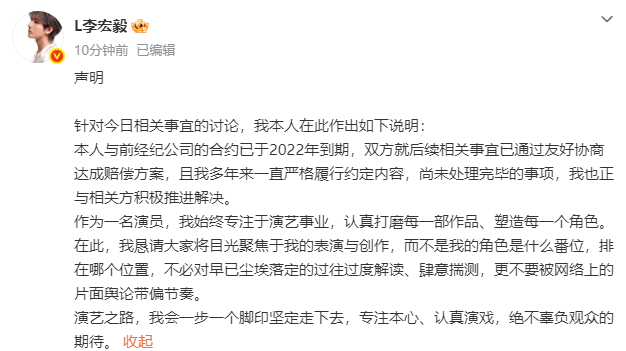 随后,李宏毅本人也发布声明,称是尚未处理完毕的事项,正与相关方积极推进解决。