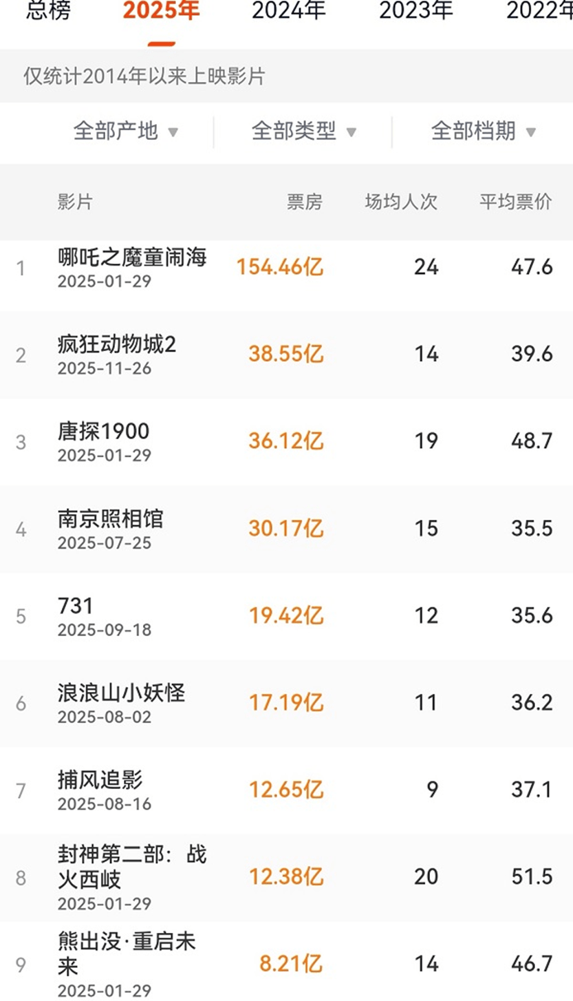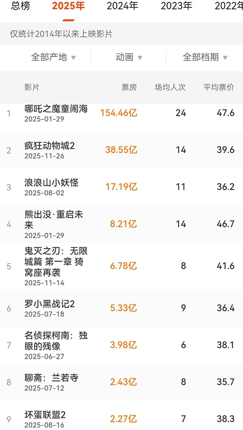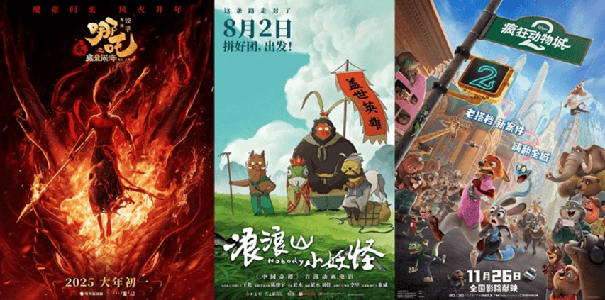 今年影市一大亮点是动画表现极其突出,年初春节档、年中暑期档、年尾贺岁档,《哪吒2》《浪浪山小妖怪》《疯狂动物城2》三部动画电影贡献了全年约四成的票房。