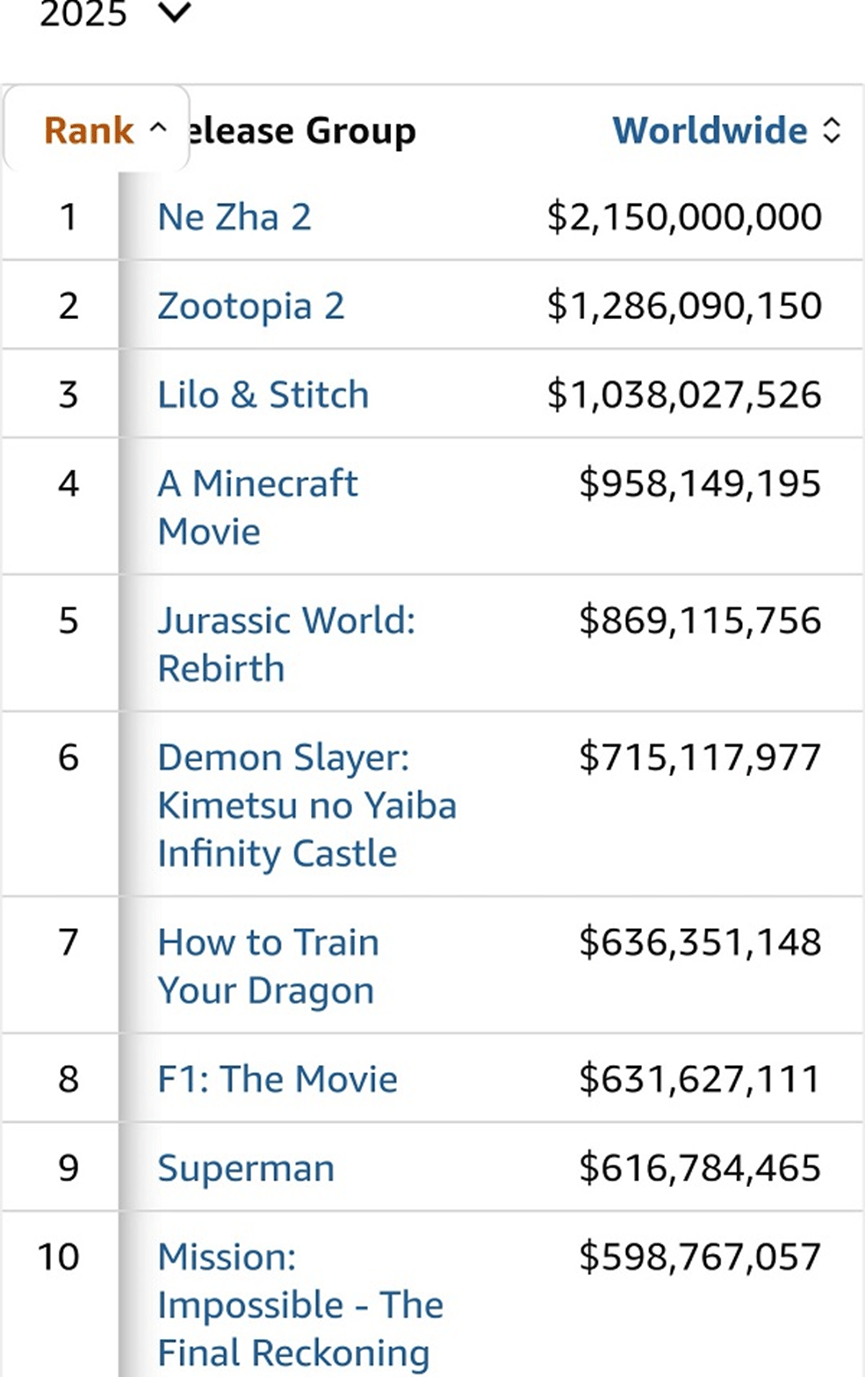 其中,《鬼灭之刃 无限城篇 第一章》大爆,日本票房386亿日元,排影史第二。北美票房1.344亿美元,打破《卧虎藏龙》保持25年的北美外语片票房冠军纪录。全球票房7.15亿美元,冲到了全球年度票房榜第六。