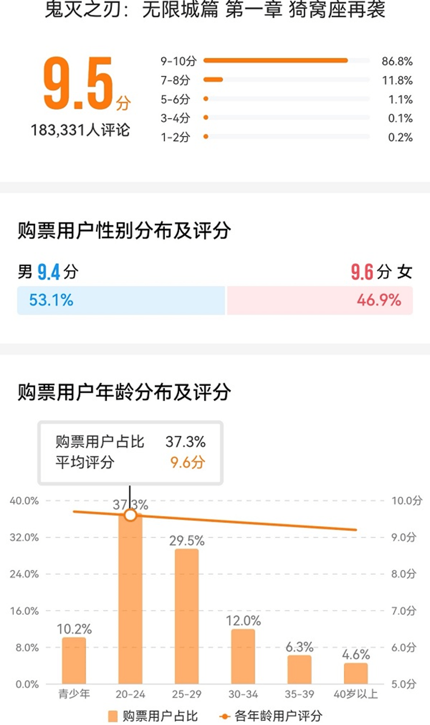 《鬼灭之刃:无限城篇 第一章》淘票票购票用户中,青少年、20-24岁、25-29岁、30-34岁、35-39岁、40岁以上各占比10.2%、37.3%、29.5%、12%、6.3%、4.6%。