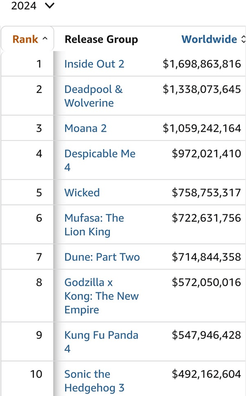 去年,好莱坞电影全球票房榜前十中,动画电影占了四部,包括排在第一的《头脑特工队2》、排在第三的《海洋奇缘2》、排在第四的《神偷奶爸4》、排在第九的《功夫熊猫4》,如果再算上第六名《狮子王:木法沙传奇》和第十名《刺猬索尼克3》,动画电影是碾压式胜出。