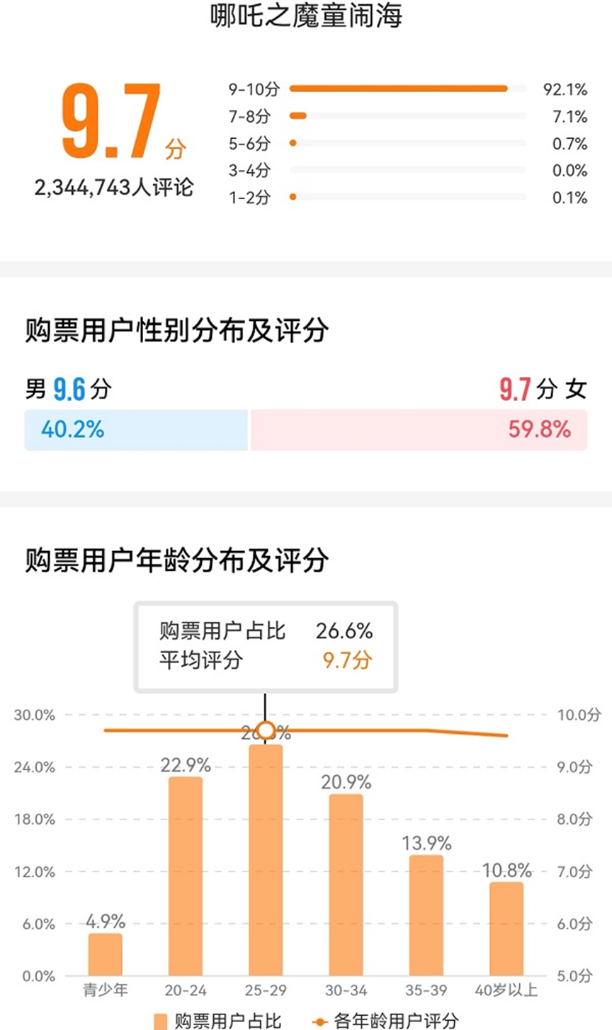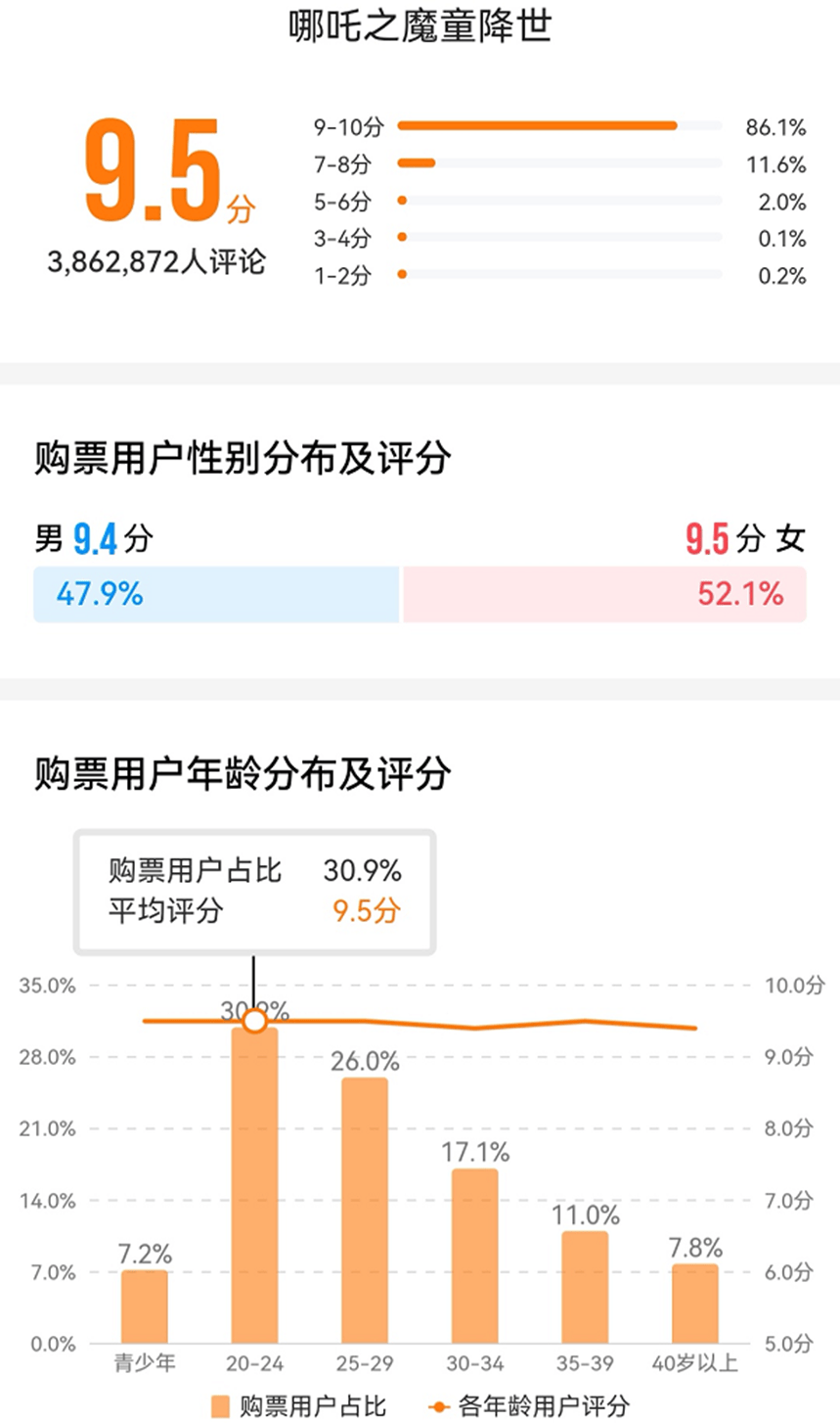 《哪吒2》的淘票票购票用户中,25-29岁、30-34岁各占了26.6%、20.9%,合计47.5%。25-35岁这个年龄段对应九零后,也就是说九零后贡献了差不多一半的票房。