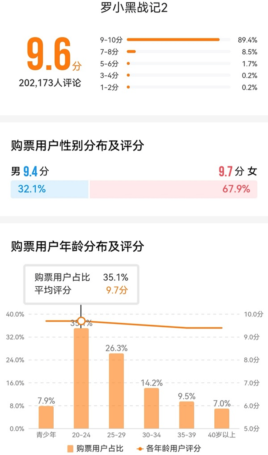 《罗小黑战记2》淘票票购票用户中,青少年、20-24岁、25-29岁、30-34岁、35-39岁、40岁以上各占比7.9%、35.1%、26.3%、14.2%、9.5%、7%。