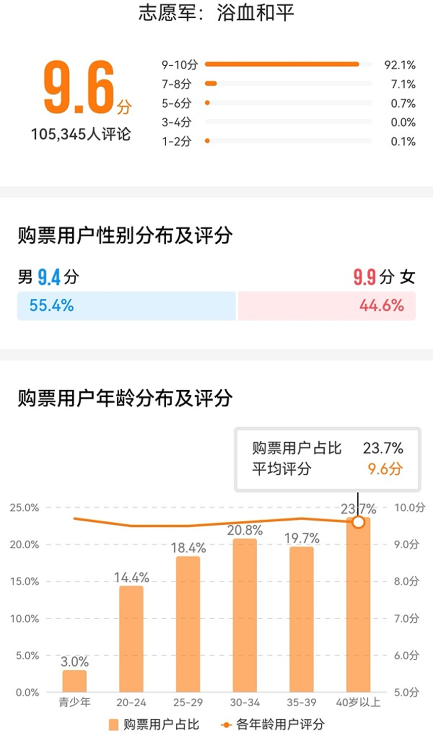 《志愿军:浴血和平》淘票票购票用户中,40岁以上占比23.7%,最多。且男性用户占比55.4%,多过女性用户。