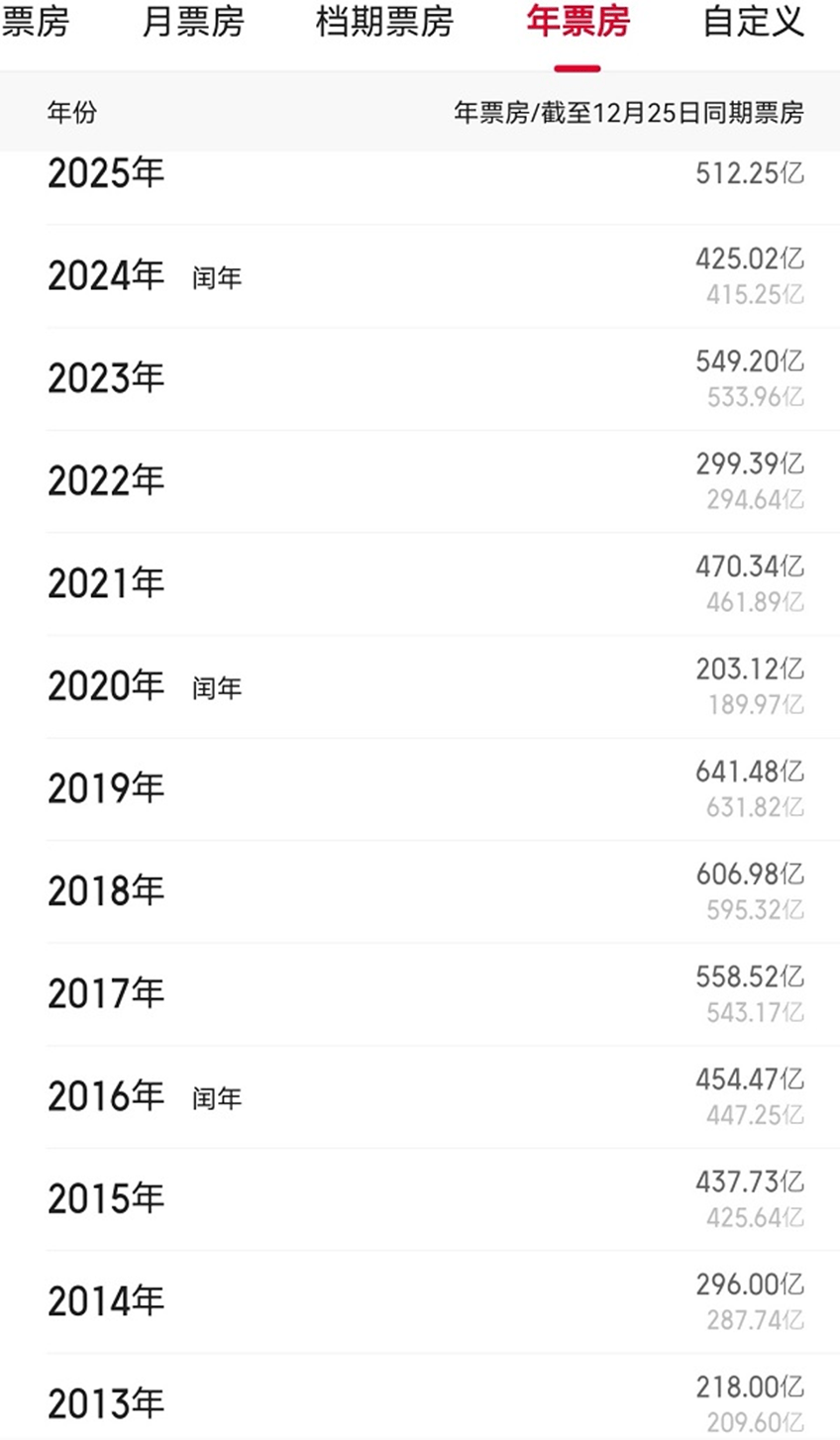 今年的电影市场,春节档大幅高开,之后低走,到年末又实现了一波不错的反弹,截止12月25日,年票房512亿元,预计全年最终票房可能落在520亿元上下,较2024年的425亿元增长22%左右。