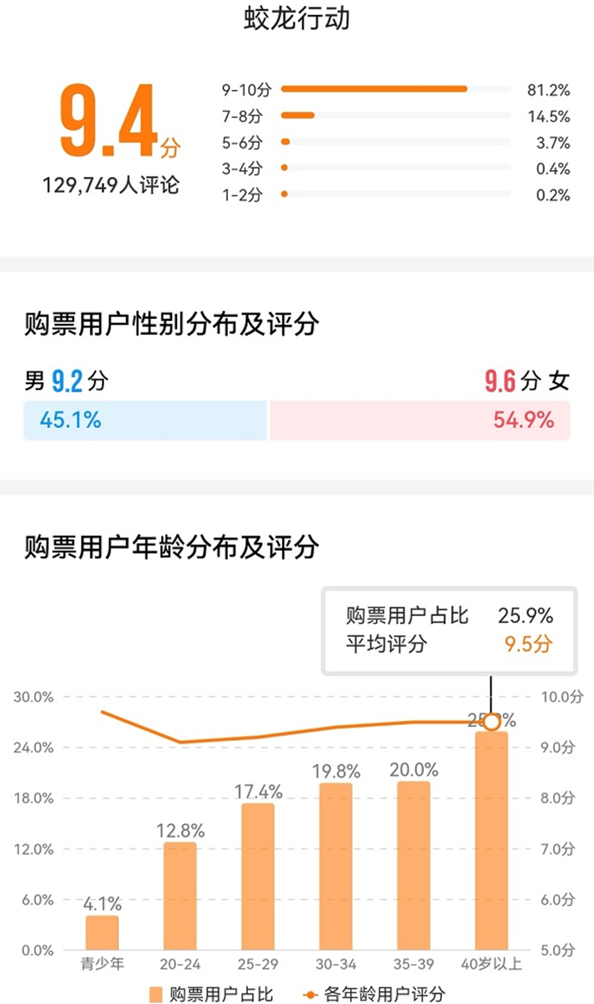而《蛟龙行动》《志愿军:浴血和平》《射雕英雄传:侠之大者》这种老牌名导拍的战争题材、武侠题材电影,40岁以上观众的占比明显更多。