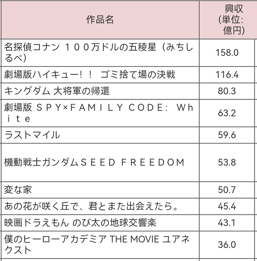 去年,日本票房前六中四部是动画电影,包括《名侦探柯南:百万美元的五棱星》《排球少年!!垃圾场决战》《间谍过家家 代号:白》《机动战士高达SEED FREEDOM》。