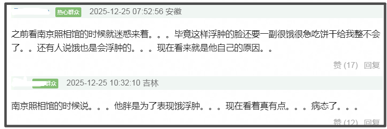 可能是王传君胖得太突然,有网友还想起了他在《南京照相馆》中的样子,称当时看剧情就觉得迷惑,不太理解为何要用浮肿的脸演绎很饿的剧情,如今看来可能就是自己的原因。据悉,该片拍摄了50多天,王传君在片中既有清瘦面孔也有浮肿胖脸,因此有网友表示怪不得看起来显病态。