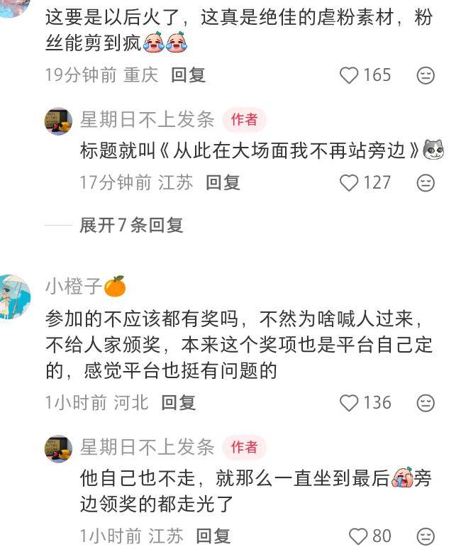 他沦为内场边缘人,整场直播都没给他什么镜头,连奖也没发给他,大多都是给了那些本来自带热度或有作品的艺人。