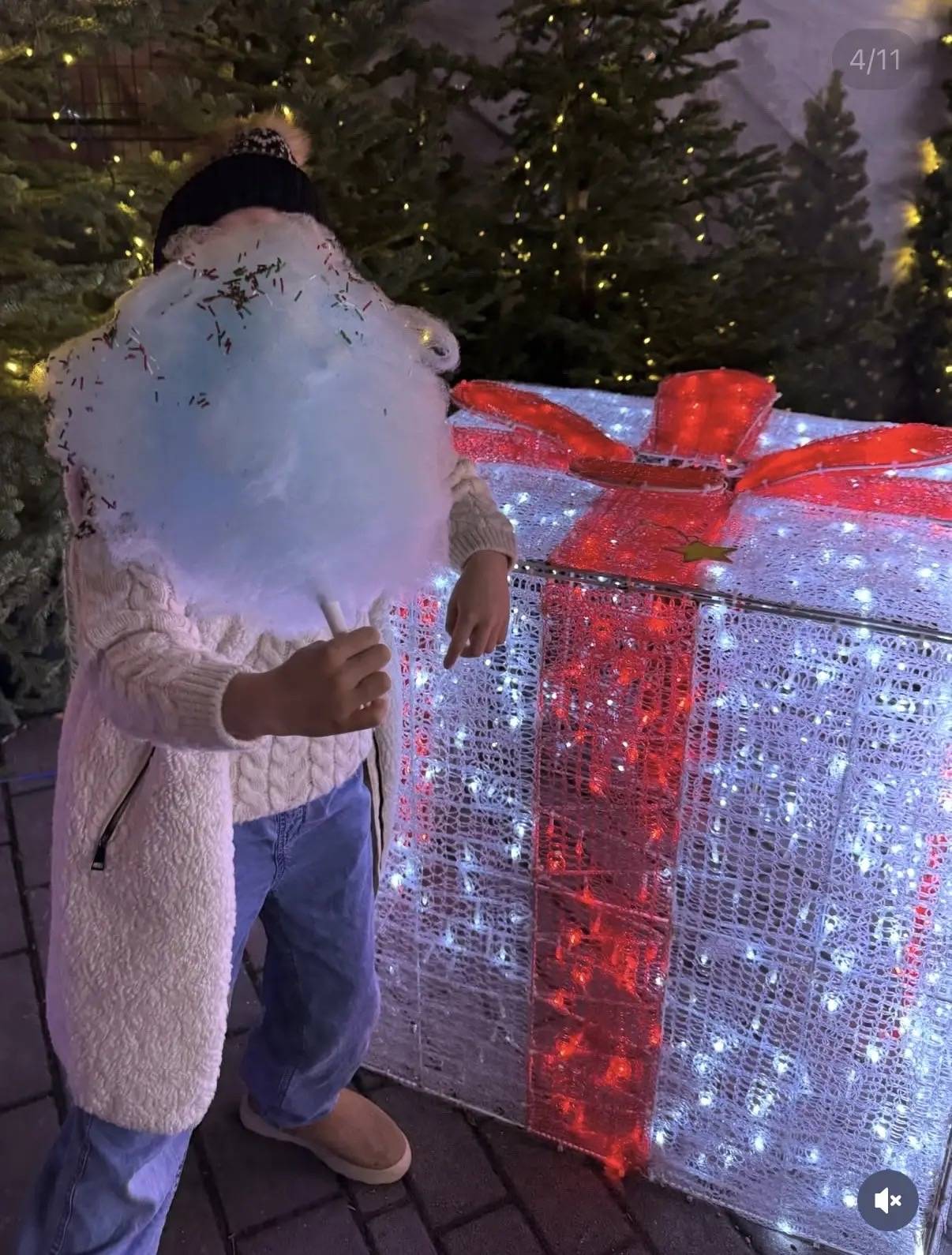 6岁的女儿非常可爱,正是喜欢蹦蹦跳跳的年纪。圣诞节的时候,外面都是各种各样的装饰,Sara手里拿着一个大大的棉花糖,把她的脸都挡住了。