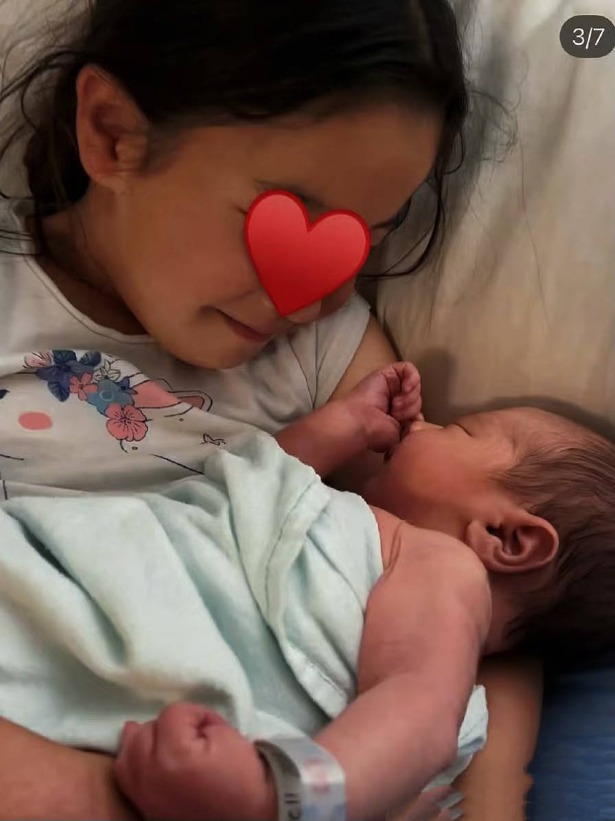 儿子刚生下来的时候,还闭着眼睛、安安静静的。女儿把他抱在怀里,就像看着一个很珍贵的礼物。