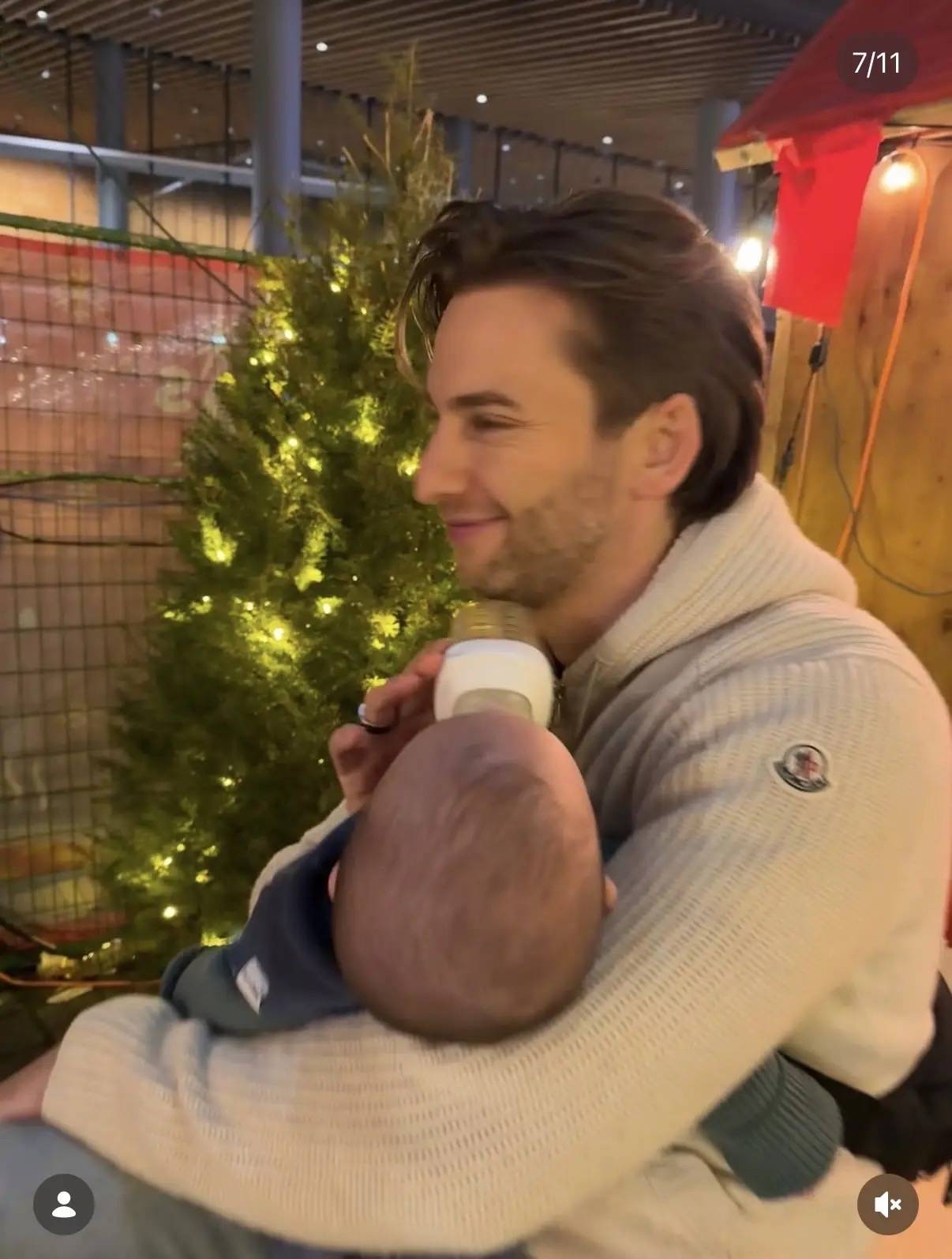 谢婷婷的男友也很帅气,圣诞节这天他负责抱娃、喂奶,只不过喂奶的动作很敷衍,虽然手里拿着奶瓶,但是头都没有低眼睛也在看向别处。