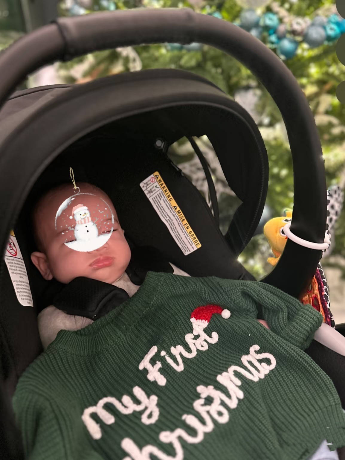 出发前,谢婷婷就给儿子打扮好了,她穿着一件绿色毛衣、灰色裤子、绿色长筒袜。毛衣上的英文字母是“我的第一个圣诞节”,谢婷婷真的是好有仪式感的人,给半岁儿子都打扮的这么隆重。