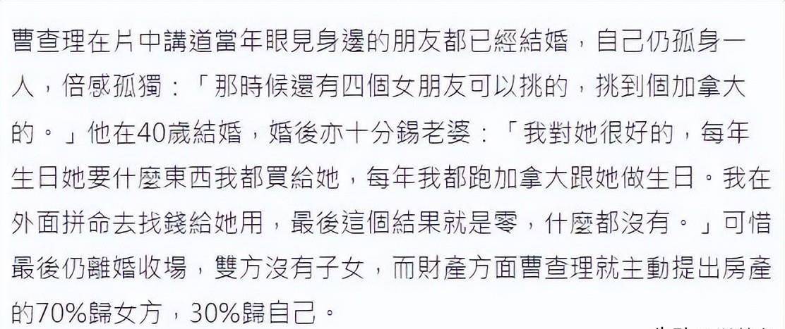 感情上的事儿,曹查理经历得挺不顺,年轻时候玩得挺嗨,女朋友换得比换衣服还勤快。