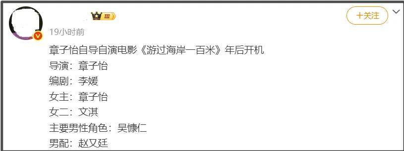 目前已有多位大V出面爆料,透露章子怡新片年后开机,名为《游过海岸一百米》,还是章子怡自导自演呢,其他演员还有文淇、赵又廷以及吴慷仁。