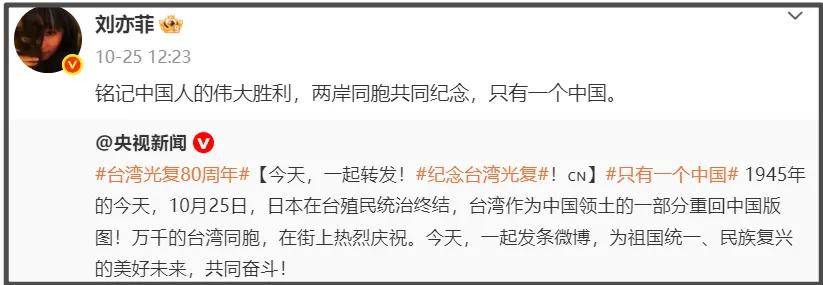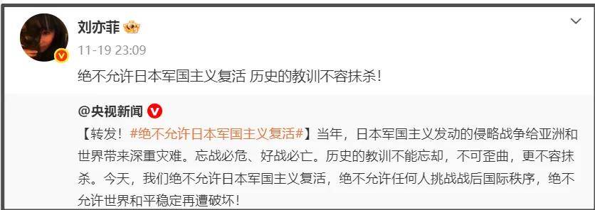 美籍华裔女星刘亦菲时常被吐槽转发表态不积极,但她近期转发一次没落,从铭记12月13日,守望和平,吾辈自强到历史教训不容抹杀,再到铭记中国人的伟大胜利,只有一个中国,明面上的态度还是很清晰的。
